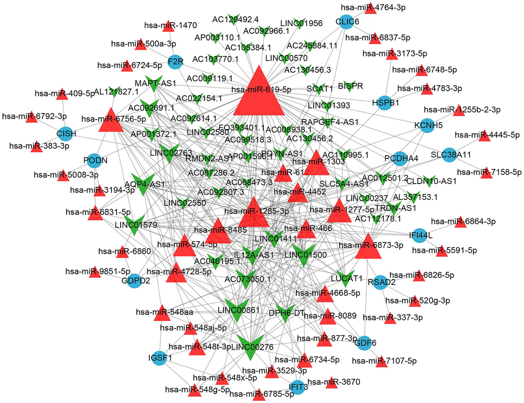 Based on the corresponding regulatory relationships between lncRNA-miRNA and mRNA-miRNA obtained from the above analysis, Cytoscape software was used to construct and visualize a ceRNA regulatory relationship network (Figure 7).