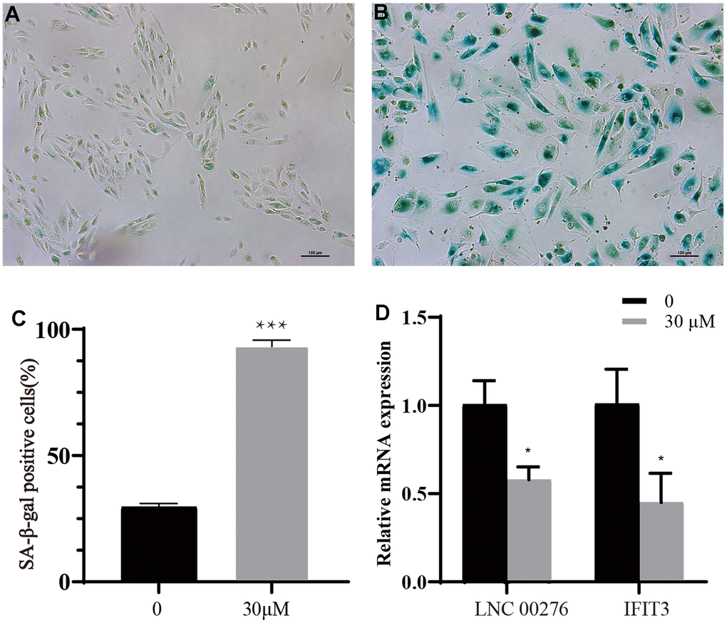 A senescent cell model was successfully constructed. The percentage of senescent cells was significantly increased in group treated with t-BH compared with normal group through SA-β-gal staining (Figure 8A–8C, *** means P<0.001 compared with control group). The expression of LINC00276 and IFIT3 was dramatically downregulated in the senescent cell as compared to the control group, which was consistent with the bioinformatic prediction outcomes (Figure 8D, * means P<0.05 compared with control group).