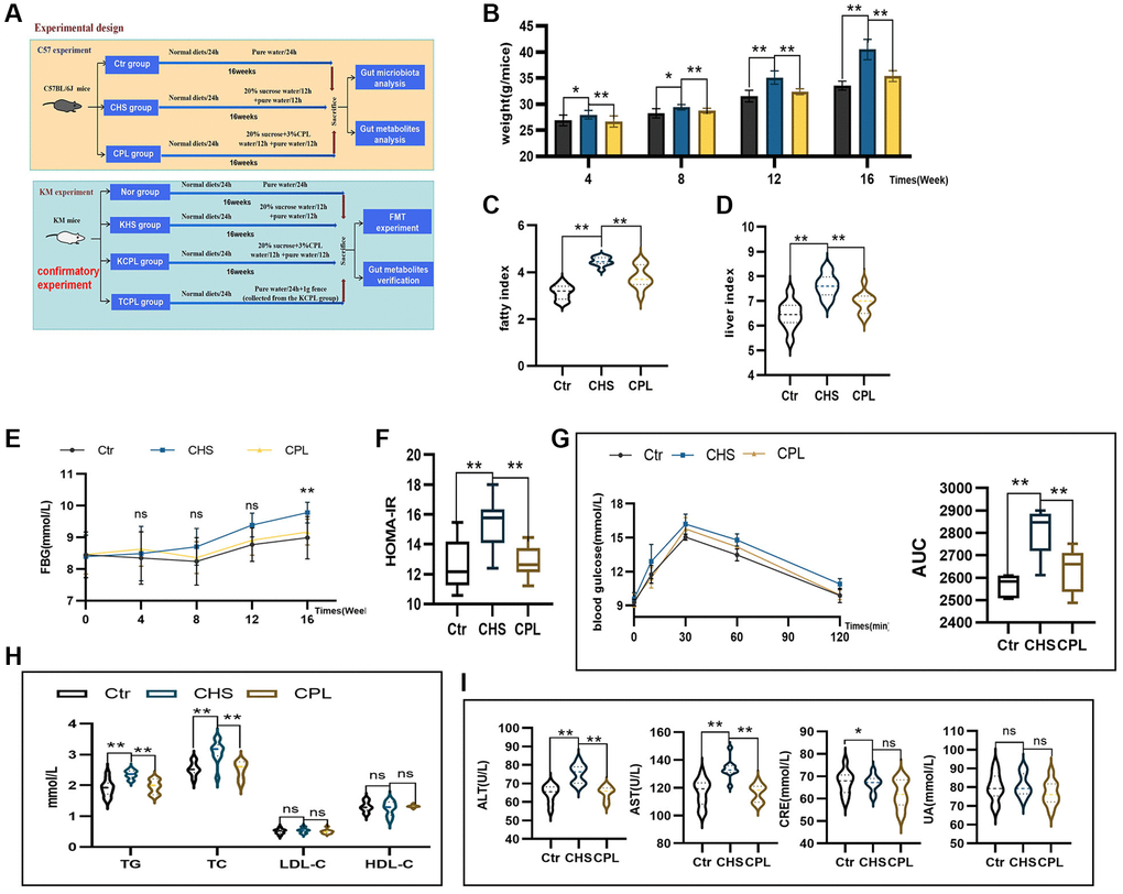 In this study, we observed the effects of CPL on high-sucrose diet-induced obesity. Furthermore, changes in the gut microbiota and in the levels of all 650 different intestinal metabolites were detected after treatment with CPL. Changes in the intestinal microenvironment will be comprehensively described in this study.