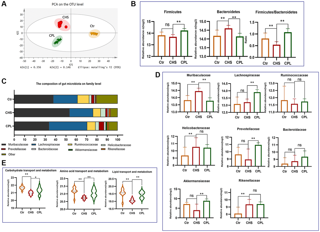 After 16 weeks of CPL intervention, the gut microbiota composition of the mice in the CPL group was unique to that of the mice in the Ctr and CHS groups (Figure 2A). According to the biological classification, gut microbes can be divided into domain, kingdom, phylum, class, order, family, genus, and species. We analyzed the changes in the gut microbiota at the phylum level and found that more than 90% of the gut microbes were Firmicutes and Bacteroidetes. Long-term consumption of sucrose clearly increased the relative abundance of Bacteroidetes (Figure 2B). CPL treatment increased the abundance of Firmicutes and decreased the relative abundance of Bacteroidetes (Figure 2B). Correspondingly, the ratio of Firmicutes to Bacteroidetes was significantly increased by CPL treatment (Figure 2B).