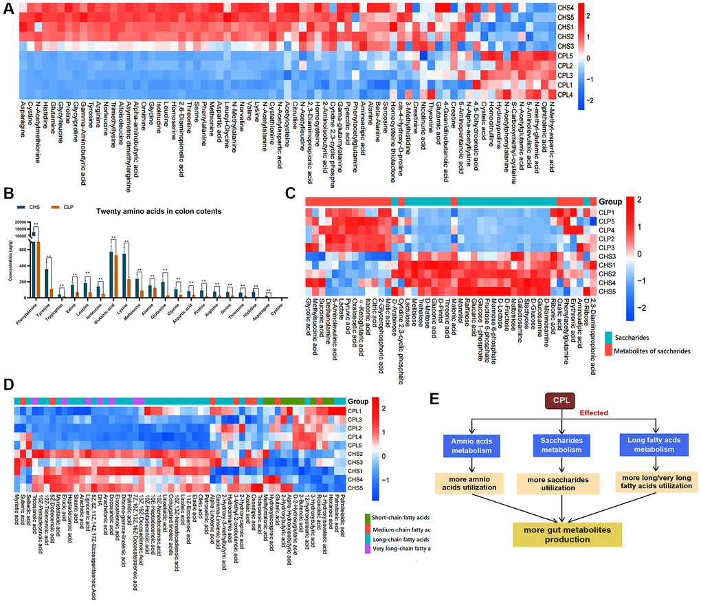 In the C57 experiment, we detected 650 metabolites in the colonic contents of the CHS group and the CPL group, but only 312 metabolites were absolutely quantified in this study (Supplementary File 1). Three macronutrients, amino acids and derivatives, fatty acids, and carbohydrates, were selected from the 312 different metabolites. Seventy-one amino acids and their derivatives were detected, and only 10 amino derivatives were residual more, additionally, sixty-one other amino acids and their derivatives were relatively less abundant in the CPL group (Figure 3A). Twenty amino acids that make up proteins were detected, and for all of them, there were less residual amino acids in the CPL group than that in the CHS group. The findings indicate that mice in the CPL group might utilize more amino acids (Figure 3B). Fifty-six fatty acids, including SCFAs, medium-chain fatty acids (MCFAs), long-chain fatty acids and very long fatty acids, were found. There were fewer residual long-chain fatty acids and very long fatty acids in the CPL group than in the CHS group. However, there were more residual SCFAs and MCFAs in the CPL group than in the CHS group (Figure 3D). Carbohydrates, mainly polysaccharides, are digested into short-chain saccharides by the gut microbiota. Compared to those in the CHS group, the levels of 11 short-chain saccharides in the CPL group were lower, but the levels of saccharide metabolites were higher (Figure 3C). These findings demonstrated that CPL could improve the utilization of amino acids, long/very long fatty acids and polysaccharides in mice with obesity induced by high sucrose and could result in the production of more SCFAs/MCFAs and metabolites of saccharides (Figure 3E).