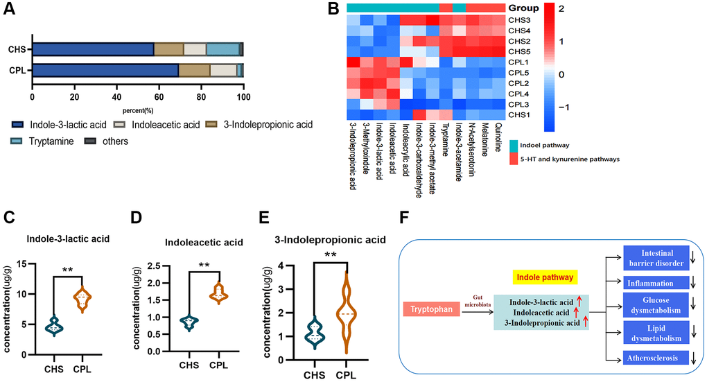 Equal amounts of protein were taken from the mice in the CHS and CPL groups, but less tryptophan was detected in the colonic contents of the CPL group. These findings might indicate that CPL increase the utilization of tryptophan in the gut. Tryptophan is involved in three main metabolic pathways: the 5-HT pathway, kynurenine pathway and indole pathway. The indole pathway, activated by gut microbes, can improve intestinal barrier disorders, alleviate gut inflammation, glucose and lipid dysmetabolism, and atherosclerosis (Figure 4F) [23].