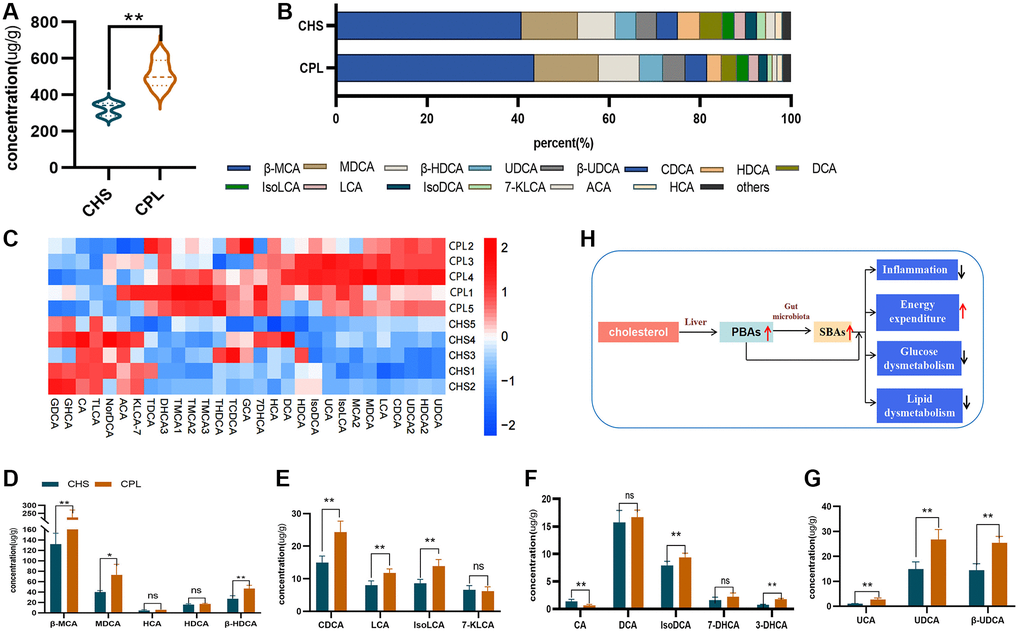 PBAs are produced in the liver with cholesterol and are transformed into SBAs through the intestinal flora [24]. Bile acids are not only vital for glucose and lipid metabolism and are also important signaling molecules for inflammation and energy expenditure (Figure 5H) [24, 25]. In this study, 29 bile acids were detected, and total bile acid levels were greatly increased by CPL treatment (Figure 5A). Only 7 bile acids were decreased, but the levels of 22 bile acids were increased in the CPL group (Figure 5B, 5C).