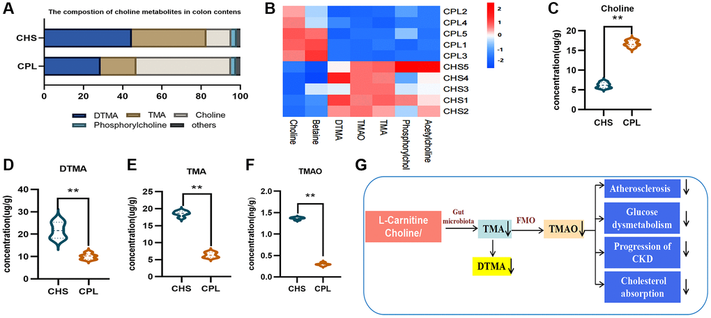 In this study, we found that choline remained more abundant in the colonic contents of mice in the CPL group (Figure 6A–6C), which indicated that less choline might be utilized by mice in the CPL group than by those in the CHS group. Correspondingly, the concentration of TMA, a metabolite of choline, was greatly reduced in the CPL group, and the dimer level was also reduced (Figure 6D–6E). TMA enters the blood and is converted to TMAO in the liver. A small amount of TMA can be converted to TMAO by gut microbes. Therefore, TMAO was detected at a low concentration in the colonic contents of mice, and at a lower concentration, it was detected in the CPL group (Figure 6F). Emerging experimental and clinical evidence shows that TMAO may be involved in the etiology of hypertension, atherosclerosis, coronary artery disease, diabetes, and renal failure [26]. Our study showed that CPL might reduce the utilization of choline and decrease the production of TMA, which could benefit the health of obese hosts (Figure 6G).