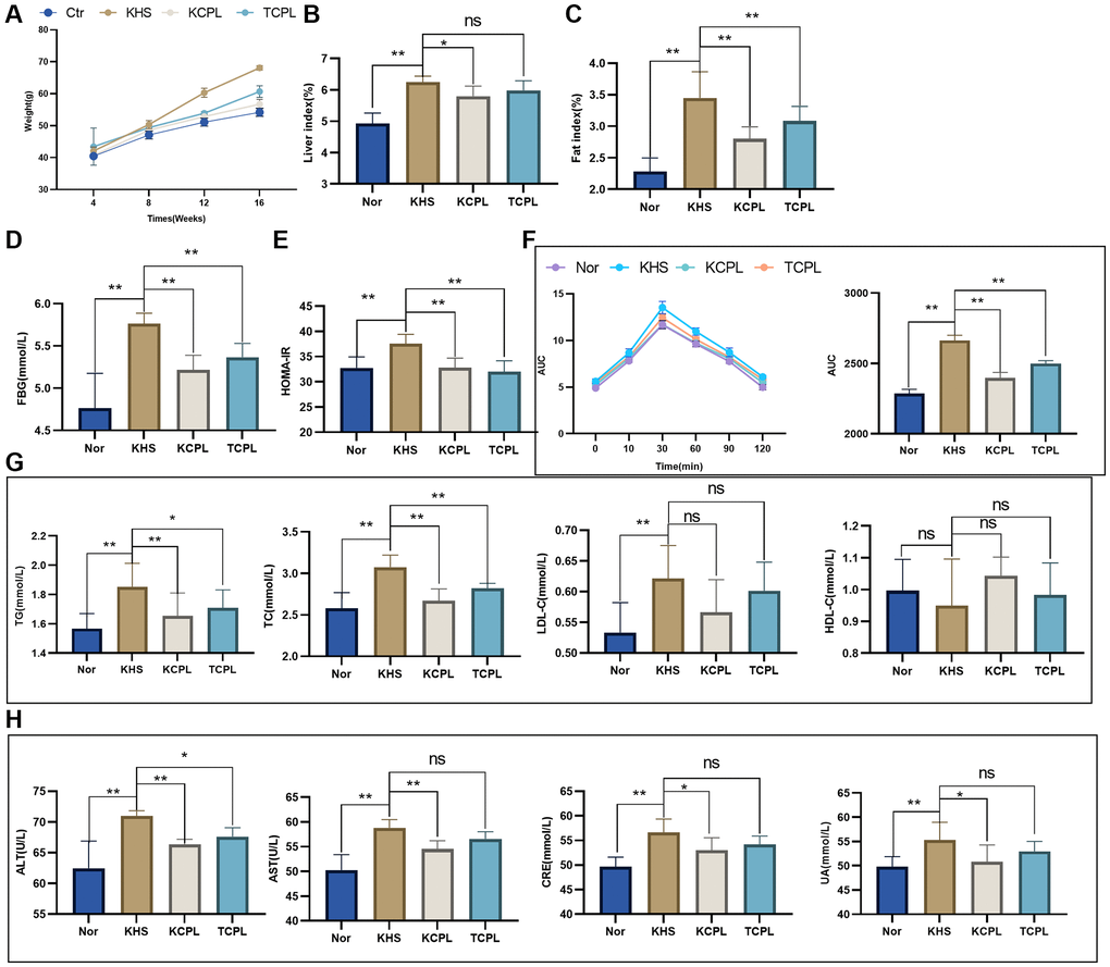 More importantly, we observed that mice in the TCPL group (FMT mice) had a lower weight, liver index and fat index. Additionally, the changes in blood glucose and lipid levels and hepatic and renal functions were greater in the TCPL group than in the KHS group (Figure 7), which indicated that CPLs might regulate gut microbes to alleviate high-sucrose diet-induced obesity.