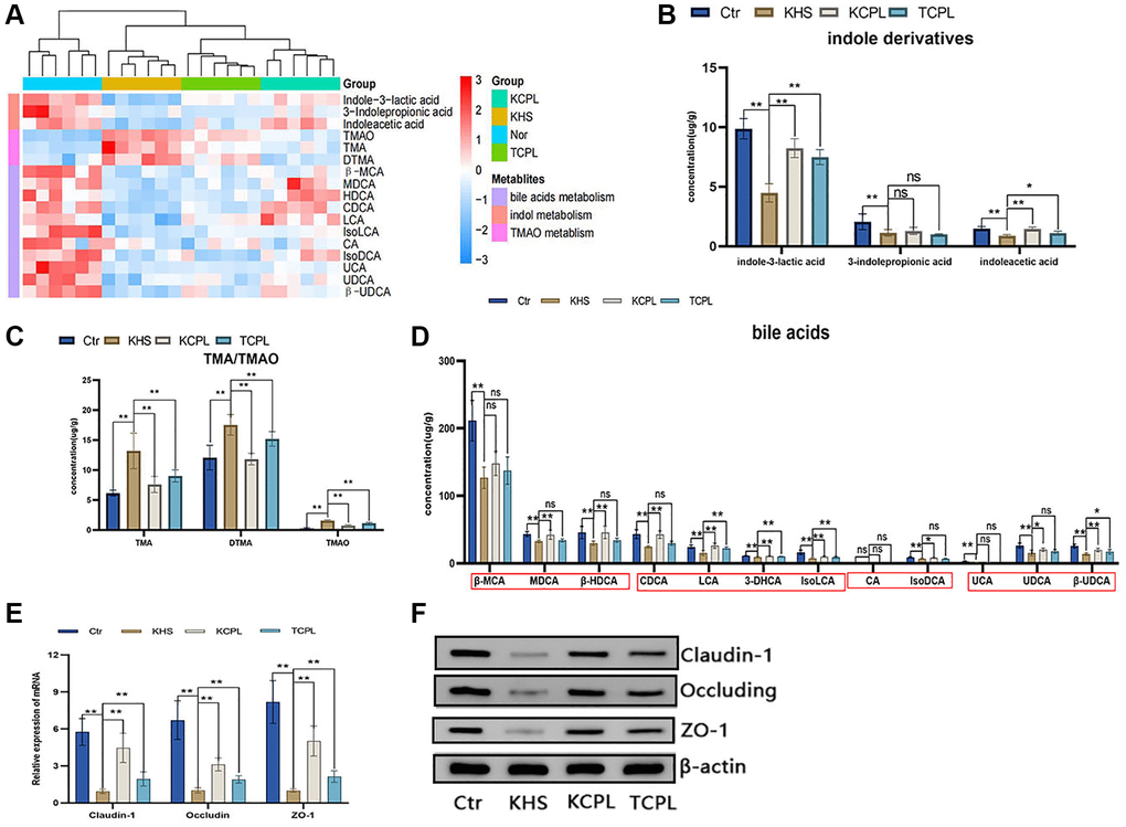 Eighteen metabolites whose expression significantly changed by high-sucrose diets were detected via redetection in the KM experiment (Figure 8A). Compared to those in the KHS group, the levels of three indole derivatives, indole-3-lactic acid, indoleacetic acid and 3-indolepropionic acid, were greater, although there was no significant difference in the level of indoleacetic acid not only in the TCPL group but also in the KCP group (Figure 8B). The concentrations of TMA and TMAO were strongly decreased in the KCPL and TCPL groups in this confirmatory experiment (Figure 8C). The changes in bile acid levels were similar to the results of the C57 mouse experiment (Figure 8D). In this study, we reconfirmed that CPLs can increase indole derivatives and bile acid levels (especially SBA levels) and decrease TMA and TMAO levels (Figure 8A–8D).