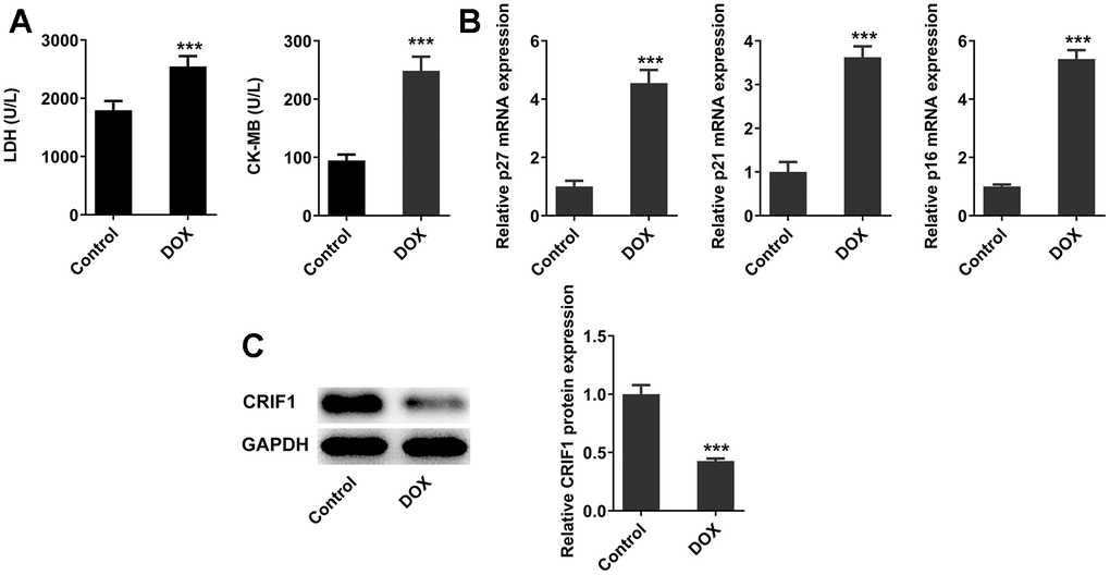 DOX induced myocardial senescence and decreased expression of CRIF1 in mice myocardial tissues