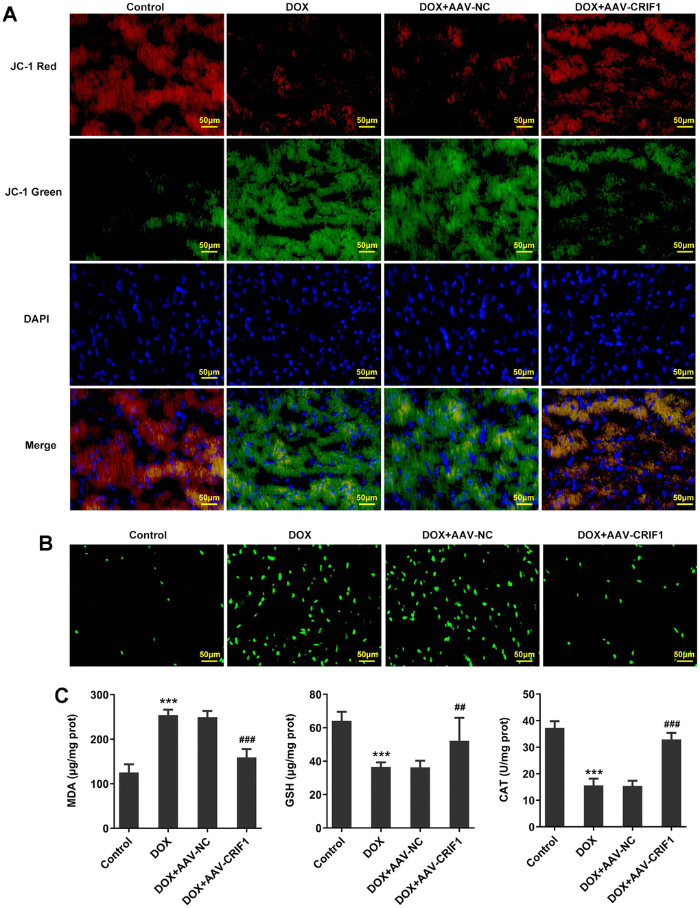 The changes of MMP were detected by JC-1 staining. We found that JC-1 red decreased and JC-1 green increased after DOX induction, indicating a significant decline in MMP. Compared with DOX+AAV-NC group, MMP was increased in DOX+AAV-CRIF1 group (Figure 4A). DCFH-DA staining was used to detect ROS levels, and the results showed that the ROS level in myocardial tissues was significantly increased after DOX induction, while ROS level was decreased after overexpression of CRIF1 (Figure 4B). The expression levels of MDA, GSH and CAT in myocardial tissues were detected by biochemical kits. We found that MDA expression increased after DOX induction, while GSH and CAT levels decreased, which was partly abolished by overexpression of CRIF1 (Figure 4C).