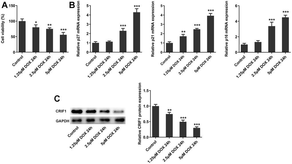 Subsequently, we further explored the molecular mechanism in cell experiments. AC16 cells were induced by DOX at different concentrations, and the cell activity was decreased significantly with the increasing DOX concentrations (Figure 5A). In addition, after DOX induction, the mRNA expressions of p27, p21 and p16 in cells were significantly increased (Figure 5B). Western blot results showed that with the increasing DOX concentrations, the expression of CRIF1 in cells decreased in a concentration-dependent manner (Figure 5C). The results of cell experiments were consistent with those of animal experiments.