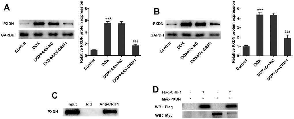 In animal experiments, we found that the expression of PXDN was significantly increased after DOX induction, while the expression of PXDN was significantly decreased after further overexpression of CRIF1 in the myocardial tissues of mice (Figure 7A). The trend was also consistent in cells (Figure 7B). CO-IP experiment results showed that CRIF1 could interact with PXDN (Figure 7C). Further, to further validate the interaction, 293T were transfected with flag-CRIF1 and/or myc-PXDN, and CO-IP assay followed by western blot was performed to examine the myc-tagged protein or flag-tagged protein. The results showed that protein expression of myc-PXDN was markedly inhibited in flag-CRIF1-mediated immunoprecipitants (Figure 7D). The above data suggested that CRIF1 could bind to PXDN and inhibit PXDN expression.