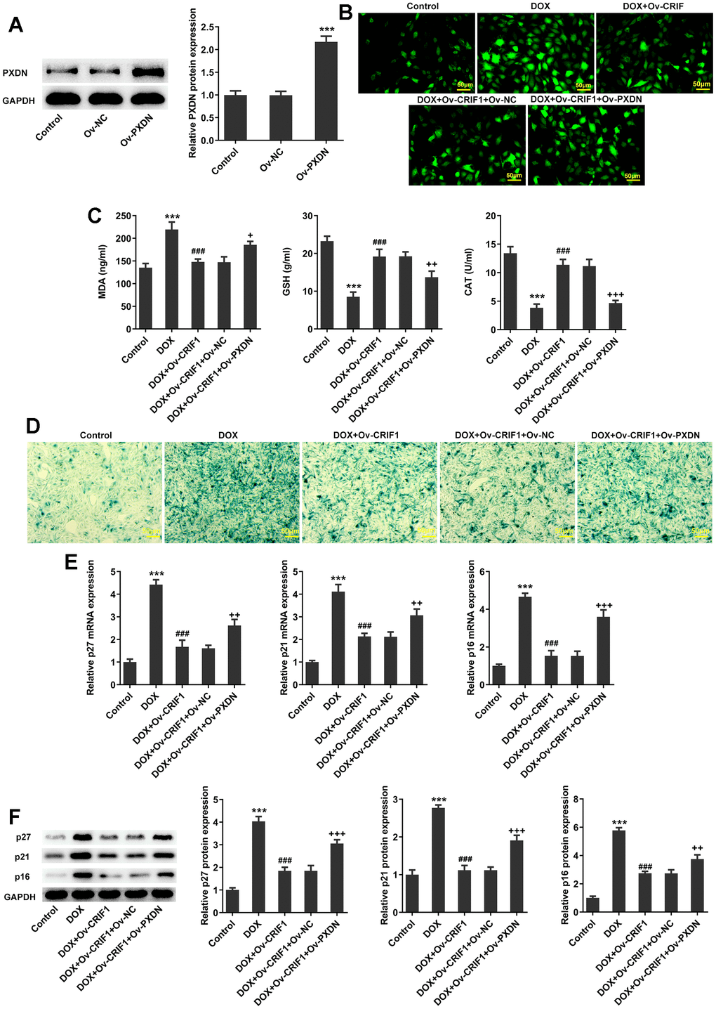 AC16 cells were transfected with Ov-PXDN to over-express PXDN (Figure 8A). Subsequently, AC16 cells were transfected with Ov-CRIF1 alone or co-transfected with Ov-CRIF1 and Ov-NC/Ov-PXDN, followed by DOX induction. It was noticed that ROS and MDA levels increased, while GSH and CAT activities decreased in DOX+Ov-CRIF1+Ov-PXDN group relative to the DOX+Ov-CRIF1+Ov-NC group (Figure 8B, 8C). SA-β-gal staining showed that overexpression of PXDN could reverse the inhibitory effect of CRIF1 overexpression on cell senescence (Figure 8D). It was also found that overexpression of PXDN could reverse the inhibitory effect of CRIF1 overexpression on p27, p21 and p16 expressions (Figure 8E, 8F).