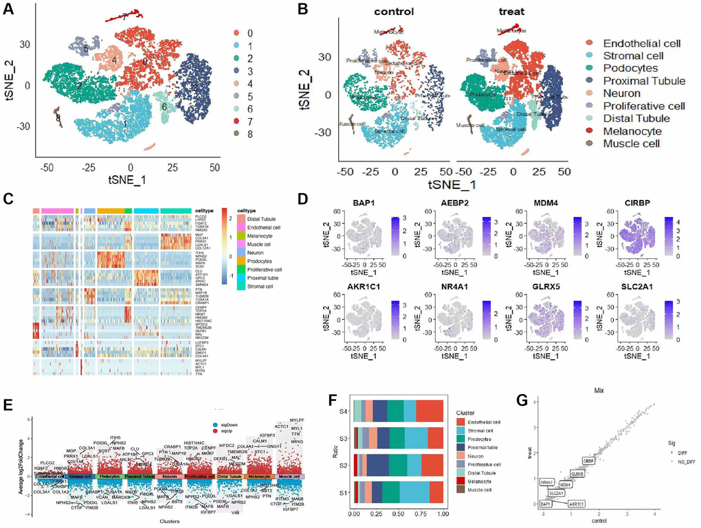 After the initial screening, logarithmic normalization and dimensionality reduction methods were employed on the scRNA-seq dataset. By utilizing the t-SNE approach, a total of 9 distinct cell subtypes were discovered (Figure 1A). The distribution of each cell subtype is visualized in the t-SNE plot shown in (Figure 1B). The 9 cell subtypes primarily comprise of Endothelial cells, Stromal cells, Podocytes, Proximal Tubules, Neurons, Proliferative cells, Distal Tubules, Melanocytes, and Muscle cells. In order to identify genes that are differentially expressed among these clusters, we employed the R package “FindVariableFeatures.” This methodology enabled the identification of genes that display significant variations across the distinct cell types. The heatmap in (Figure 1C) displays the most prominently expressed differentially regulated genes in each cellular cluster, with the stromal cell cluster showing notably elevated expression levels of COL3A1, MGP, PRRX1, LGALS1, and COL1A1 (Figure 1D) displays the 8 marker genes utilized for single cell clustering analysis. Furthermore, volcano plots were employed to illustrate the top 5 highly expressed and lowly expressed genes in each of the nine cell subtypes (Figure 1E). (Figure 1F) illustrates the proportional distribution of cell subtypes in the four examined samples, showcasing the prevailing presence of Endothelial cells, Podocytes, and Stromal cells within the tissue. Furthermore, (Figure 1G) demonstrates the distribution of gene expression levels between the control and disease groups. Genes exhibiting a linear pattern on the diagonal line indicate consistent expression patterns in both groups.