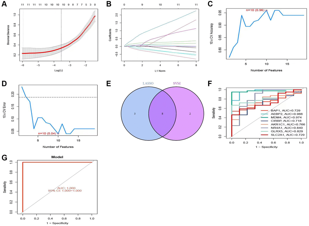 The GSE98320 dataset was employed to develop a predictive model. Lasso Cox regression analysis was utilized to identify a selection of 11 genes associated with iron-induced mortality. These genes were then used for the construction of the prediction model, as shown in (Figure 3A, 3B). The support vector machine (SVM) algorithm was subsequently employed for the development of a prediction model for AKI, utilizing a set of 10 genes associated with iron-induced mortality (Figure 3C, 3D). In order to ensure the precision of the genes utilized for model development, the intersection of genes derived from both models was determined, resulting in the identification of 8 shared genes (Figure 3E). The predictive diagnostic results of the eight target genes for AKI in the validation set are displayed in (Figure 3F). The area under the curve (AUC) value was computed for each individual gene and for the comprehensive diagnosis. The AUC values for the individual genes were as follows: BAP1: AUC = 0.729; AEBP2: AUC = 0.966; MDM4: AUC = 0.974; CIRBP: AUC = 0.718; AKR1C1: AUC = 0.766; NR4A1: AUC = 0.840; GLRX5: AUC = 0.829; SLC2A1: AUC = 0.729. The ROC curve analysis indicated that the AUC value for the comprehensive diagnosis utilizing the eight target genes was 1, with a 95% confidence interval of 1–1 (Figure 3G).