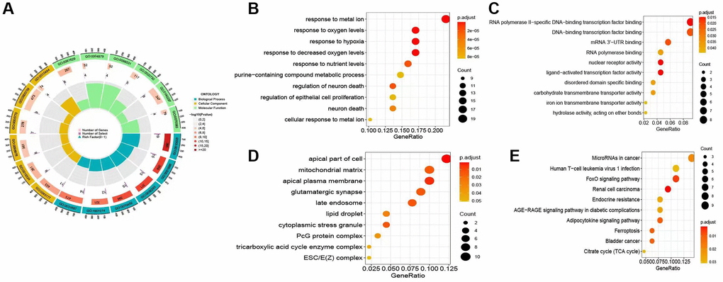 The DEGs related to ferroptosis were determined using an adjusted p-value less than 0.01 and a |logFC| greater than or equal to 1.5, between the normal and AKI groups. In this manner, duplication rates are reduced. The possible involvement of these DEGs AKI was investigated using GO and KEGG enrichment analyses. The GO enrichment analysis demonstrated a significant enrichment of immune-related biological processes among the DEGs identified (Figure 4A). The KEGG enrichment analysis further revealed a notable enrichment of various pathways associated with cell proliferation and the cell cycle in the DEGs (Figure 4B–4E).