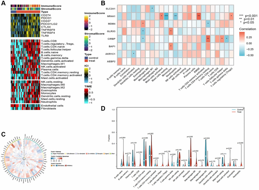 After examining the distribution of immune and stromal cell infiltration within both normal and diseased cohorts, a notable disparity was observed, with the disease group demonstrating a greater prevalence of immune and stromal cell infiltration compared to the normal group (Figure 5A). Moreover, the study revealed a greater prevalence of CD8 T cells, Tregs cells, CD4 naïve cells, and memory B cells within the disease group. Furthermore, an investigation was conducted to assess the correlation between model genes and immune cell populations. In (Figure 5B, 5C), a strong correlation was observed between several genes, including NR4A1, CIRBP, MDM4, GLRX5, and immune cells. Specifically, gene NR4A1 exhibited positive correlations with Mast cells resting, RMSE, and Tregs, but negative correlations with Mast cells resting and Neutrophils. Additionally, the comparison of 22 immune-related cells between the two groups revealed that the normal group had a higher abundance of Macrophages M2 cells, while Monocytes and Macrophages M0 cells were more prevalent in the disease group (Figure 5D). These findings suggest significant relationships between specific genes and immune cell populations, highlighting potential implications in disease mechanisms [9]. M0 macrophages, characterized as unactivated and immature, perform the crucial function of phagocytosing and clearing cellular debris, initiating inflammatory responses [10]. Conversely, M2 macrophages are primarily anti-inflammatory and involved in the reparative and regenerative processes [11], generating anti-inflammatory mediators like IL-10 and TGF-β, thus alleviating inflammation and promoting tissue repair and regeneration [12]. In summary, M2 macrophages have distinctive roles in immune responses and inflammation, while M0 macrophages remain in an undifferentiated state with neutral characteristics [13]. Manipulating the ratio of M2 macrophages offers potential for regulating immune and inflammatory responses, providing a foundation for potential treatment strategies for AKI [14].