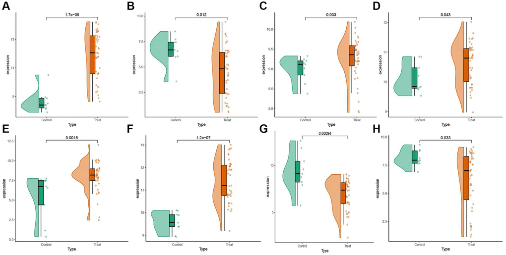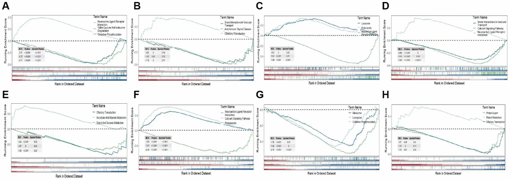 Gene Set Enrichment Analysis (GSEA) was conducted to investigate variances in gene function among the KEGG pathways of the selected target genes. Notably, AEBP2 displayed significant associations with the following pathways: neuroactive ligand receptor interaction, valine leucine isoleucine degradation, and oxidative phosphorylation (Figure 6A). The involvement of AKR1C1 was demonstrated in vesicular transport snare interactions, autoimmune thyroid disease, and olfactory transduction pathways (Figure 6B). In (Figure 6C), BAP1 appeared to be significantly enriched in the lysosome, endocytosis, and neuroactive ligand signaling pathways. In (Figure 6D), CIRBP exhibited connections with vesicular transport involving SNARE interactions, the calcium signaling pathway, and neuroactive ligand receptor interactions. GLRX5 displayed enrichment in pathways related to olfactory transduction, ascorbate and aldarate metabolism, and starch and sucrose metabolism (Figure 6E). MDM4 was found to be associated with pathways such as neuroactive ligand receptor interaction, calcium signaling and proteasome pathways (Figure 6F). NR4A1 exhibited enrichment in pathways such as ribosome, lysosome, and oxidative phosphorylation (Figure 6G). SLC2A1 was identified to be enriched in pathways related to protein export, retinol metabolism, and olfactory transduction (Figure 6H). An examination was carried out to determine the levels of expression of these 8 selected genes in both the disease group and the normal group (Figure 7A–7H). The findings indicated that SLC2A1 (Figure 7A), AEBP2 (Figure 7C), BAP1 (Figure 7D), CIRBP (Figure 7E), and GLRX5 (Figure 7F) exhibited significantly higher expression levels in the disease group. Conversely, MDM4 (Figure 7B), AKR1C1 (Figure 7G), and NR4A1 (Figure 7H) demonstrated elevated expression levels in the normal group.