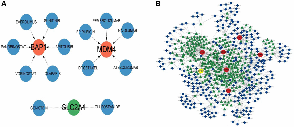 Cytoscape was utilized for the construction of the CeRNA network and analysis of drug regulation. This investigation unveiled connections between the model genes and various drugs, such as everolimus, sunitinib, panobinostat, apitolisib, vorinostat, and olaparib, particularly in relation to BAP1. Additionally, the association of MDM4 with epirubicin, pembrolizumab, nivolumab, atezolizumab, and docetaxel was observed, whereas SLC2A1 showed an association with genistein and glufosfamide (Figure 8A). Furthermore, the interactions among model genes, miRNA, and LncRNA were further investigated, with an elevated expression indicated by the color red and a diminished expression represented by the color yellow (Figure 8B).