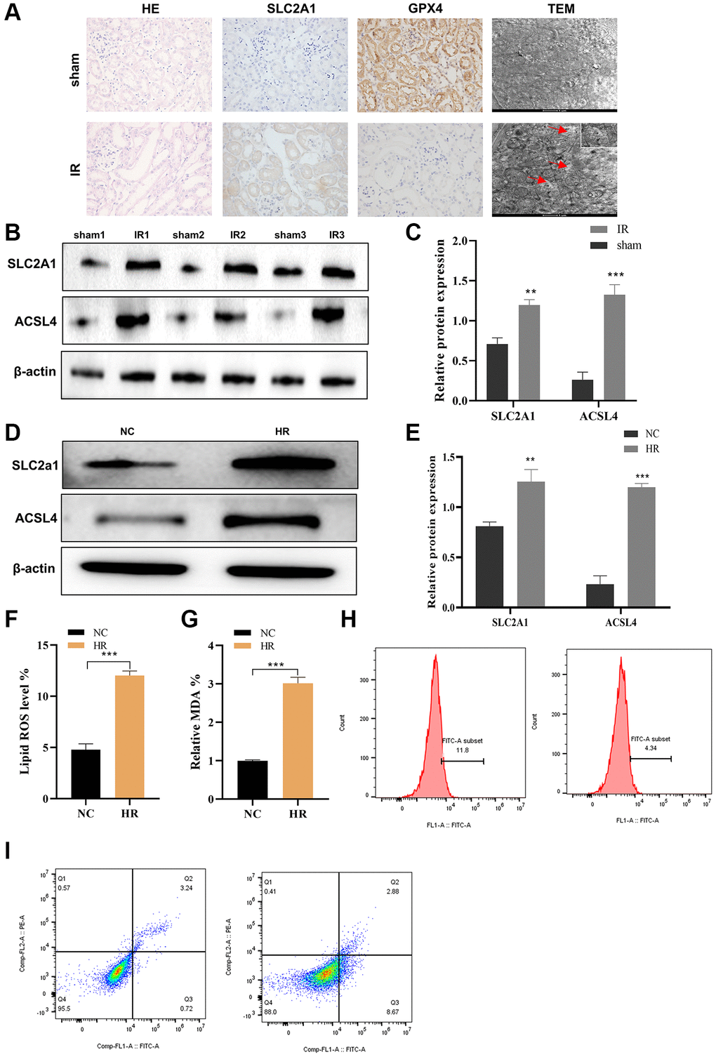 Based on our experimental results, we observed a significant upregulation of SLC2A1 and ACSL4 expression in the kidneys of mice subjected to an ischemia-reperfusion injury model of AKI. Additionally, in the HK-2 cell line, we found that hypoxia-reoxygenation resulted in upregulation of ACSL4, and SLC2A1 expression. These changes were accompanied by lipid peroxidation and an increase in cell apoptosis rate.