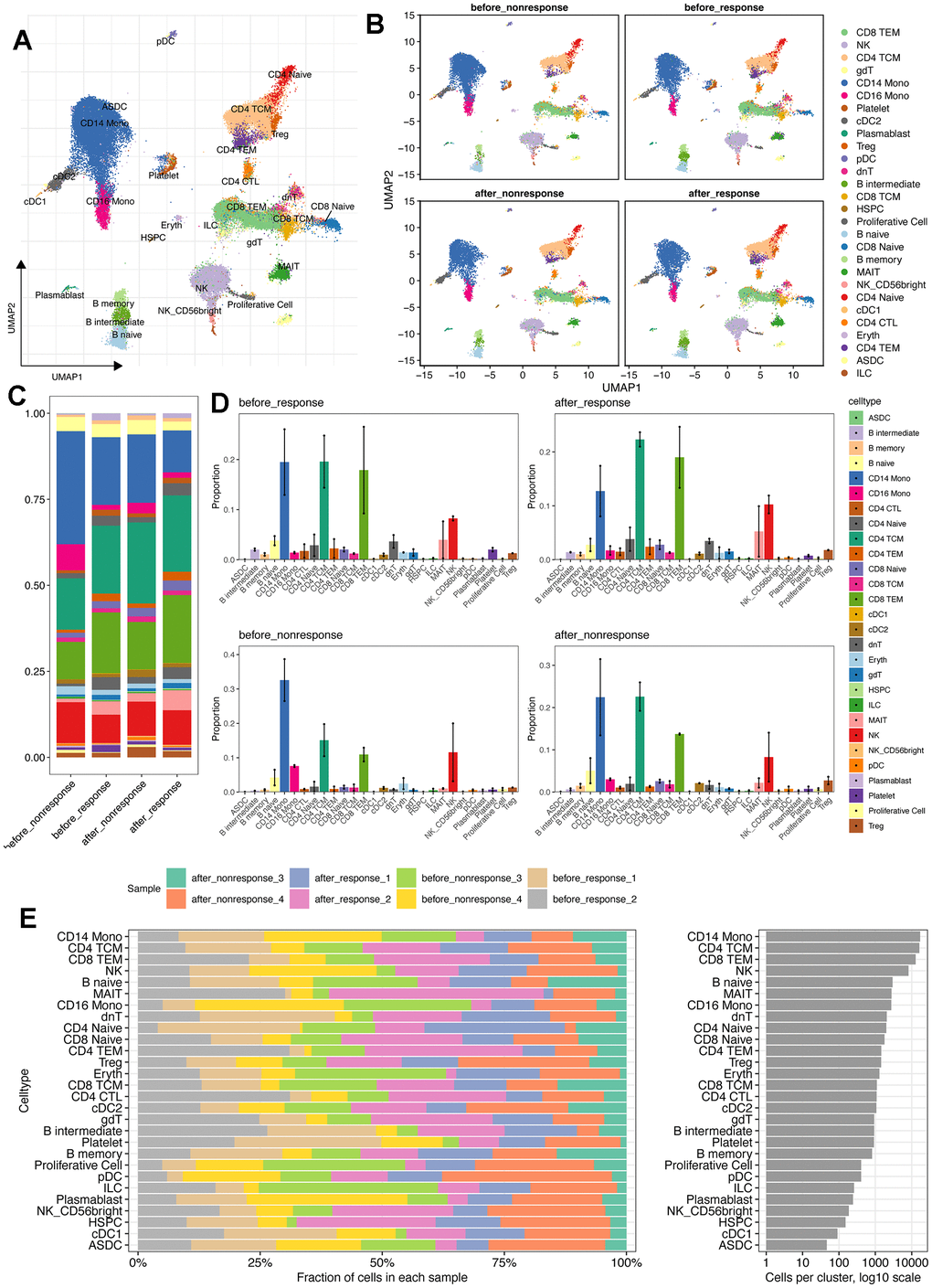 Human umbilical cord mesenchymal stem cells (hUC-MSCs) were administered via intravenous injection at a dose of 1×106 cells/kg for heart failure patients [10]. Clinical assessments and evaluations were conducted on patients one week before cell implantation and at 1 month and 6 months after transplantation. These assessments included routine physical examinations, vital sign monitoring, adverse event evaluation, laboratory tests, and functional measurements (Supplementary Tables 1, 2). The above clinical monitoring showed improvement in patients after stem cell therapy. To further investigate the reasons behind the differences in treatment efficacy among patients, single-cell RNA-sequencing was performed on peripheral blood mononuclear cells (PBMCs) collected from four patients at both pre-treatment and one-month post-treatment, resulting in a total of 8 PBMC samples.