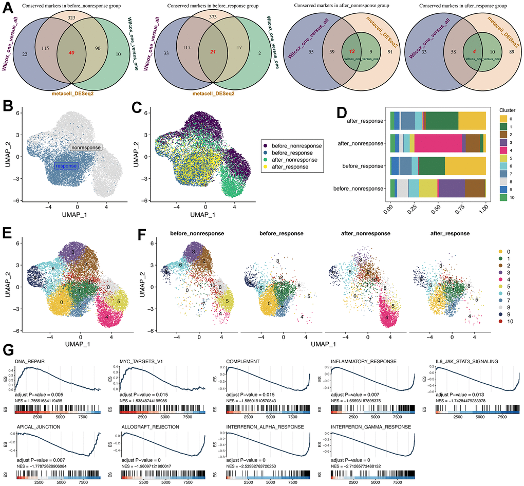 For better investigating the characteristics of CD14+ monocytes in the “before_response” group, we utilized the subcluster analysis based on the NMF dimension reduction. As a result, 11 subclusters of CD14+ monocytes were obtained (Figure 2D–2F). Then, we used GO (Supplementary Figure 4), KEGG and Reactome (Supplementary Figure 5) databases for function enrichment analyses. Interestingly, we confirmed the various function of different subclusters. For instance, the cluster 0 was enriched in “IL−17 signaling pathway”, “Neutrophil degranulation” and “cellular response to chemical stress”, while cluster 1 was enriched in “Viral myocarditis”, “Interferon Signaling” and “positive regulation of leukocyte cell− cell adhesion”. Then, we also found that cluster 0 (2786 cells) was predominantly enriched in the “before_response” group and would be down-regulated after MSC treatment (Figure 2F). Thus, we identified cluster 0 as “therapy-response CD14+ monocytes”. Further, we leveraged the GSEA analysis for running the enrichment analysis of HALLMARK datasets (downloaded from http://www.gsea-msigdb.org). Of interest, the potential function of response CD14+ monocytes were mainly related to “COMPLEMENT”, “INFLAMMATORY RESPONSE”, “INTERFERON_GAMMA_RESPONSE” and so on, which were highly related to the therapeutic mechanism of MSCs (Figure 2G).