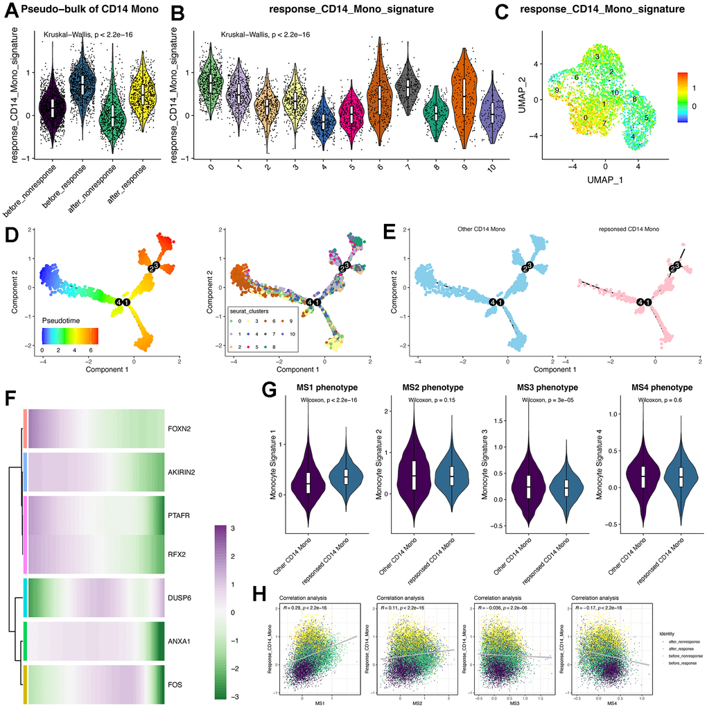 Then, we used the “addmodule” function in Seurat package for calculating the signature score of the seven therapy-response-specific and up-regulated genes (Figure 4A–4C). Of note, the signature score was higher in CD14+ monocytes from the “before_response” group (Figure 4A) and was also higher in cluster 0 (therapy-response CD14+ monocytes) (Figure 4B, 4C). Then, we performed the pseudotime analysis using monocle2 algorithm [24]. Intriguingly, we could find that the cluster 0 was mainly distributed in the early and middle timepoint of the pseudotime plot (Figure 4D, 4E). Then, we detected the expression pattern of the seven genes, most of which were consistent with the pseudotime distribution (Figure 4F). Considering that the middle stage character and potential FOS/JUN-related function of therapy-response CD14+ Monocytes, which indicated that the therapy-response CD14+ Monocytes might be much more flexible and its state would be shifted, it triggered us to understand whether its status might be similar to the published monocyte signature (MS) reported by Reyes et al. [29], whose research has found four monocyte signatures in the PBMC of sepsis patients and considered MS1 as a unique disease-related CD14+ monocytes state that is expanded in sepsis patients and has validated its power in distinguishing sepsis patients from healthy controls [29]. Interestingly, we found that the therapy-response CD14+ monocytes also had higher MS1 score than other CD14+ monocytes (Figure 4G) as well as positively correlated with the MS1 score (Figure 4H). In summary, the state of therapy-response CD14+ monocytes might also be different from other CD14+ monocytes, and might be an indicator of those HF patients with could potentially benefit from MSC therapy.