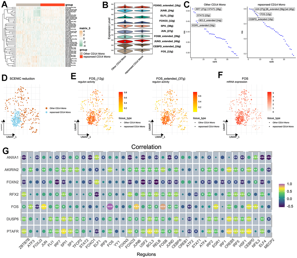 Single-cell regulatory network inference and clustering (SCENIC) is a GRN (gene regulatory network) algorithm specifically developed for single-cell data [26]. Its innovation stems from the incorporation of a gene co-expression network, deduced through transcription factor motif sequence validation statistical methods, which are capable of identifying highly reliable, TF-driven GRNs. Using SCENIC analysis, we further emphasized the importance of FOS.
