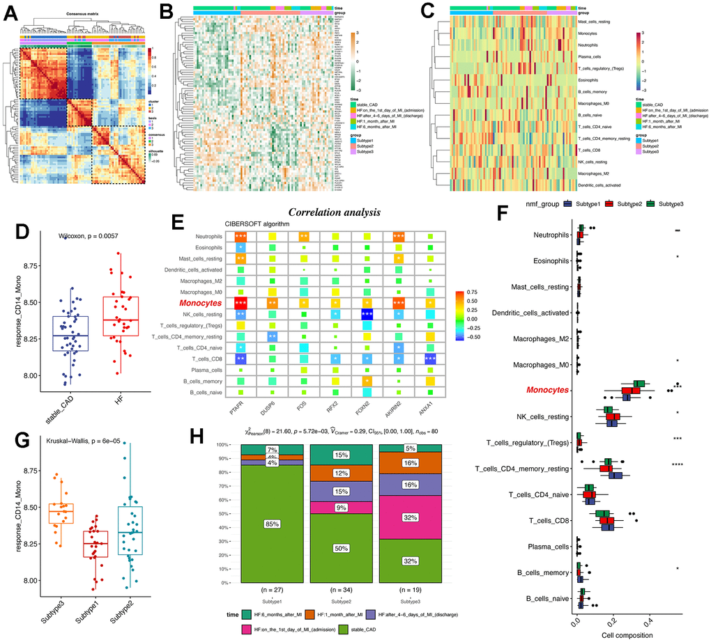 NMF subtype analyses reveals monocyte signatures were capable of classifying post-MI HF patients into three groups