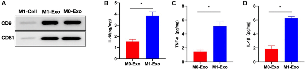 Marker detection results indicated that CD9, CD81 were highly expressed in exosomes (Figure 1A). As discovered after exosomal analysis, inflammatory cytokines (IL-18, IL-1β, and TNF-α) of M1-Exo group increased relative to M0-Exo group, and M1-Exo served as an inflammatory mediator (Figure 1B–1D).