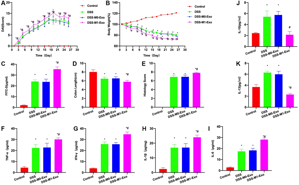 After intraperitoneal injection M0-Exo and M1-Exo in mice, results revealed that M0-Exo did not significantly promote colitis in M0-Exo group, while M1-Exo promoted colitis progression. According to DAI score analysis, the DAI score of DSS group increased with time, M0-Exo and DSS groups did not exhibit ant significant difference, but DAI score of M1-Exo group apparently increased relative to DSS group (Figure 2A). In body weight measurement, DSS group had gradually reduced body weight, while M0-Exo and DSS groups did not exhibit any significant difference, and M1-Exo group had more weight loss than DSS group (Figure 2B). Moreover, FITC-D detection found that the mucosal barrier permeability of DSS mice increased, and FITC-D level increased, while the FITC-D level in M1-Exo group increased relative to DSS group (Figure 2C). Colon length of DSS group was markedly shortened, that of M1-Exo group was shortened, and pathological score analysis revealed the higher score of M1-Exo group than DSS group (Figure 2D, 2E). Inflammatory factors were detected, as a result, IFN-γ, IL-6, IL-1β and TNF-α levels of DSS group increased IL-6, IL-1β and TNF-α levels of DSS group increased relative to Control group, and these levels of M1-Exo group further increased compared with DSS group (Figure 2F–2I). Although IL-10 and IL-13 levels of DSS group increased, they decreased in M1-Exo group (Figure 2J, 2K).