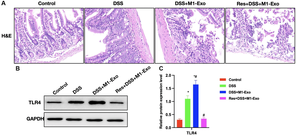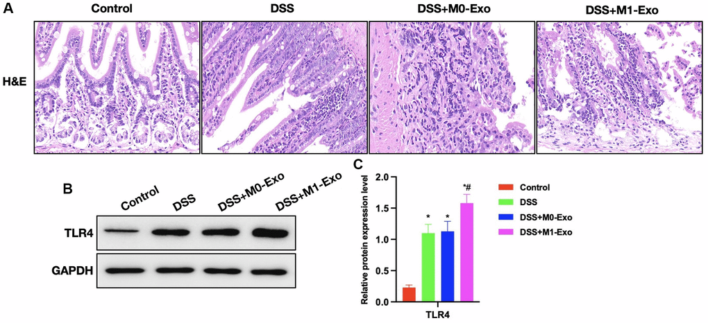 According to H&E staining, intestinal tissue of DSS group showed apparent edema, inflammatory tissue, and epithelial cell injury, while that in M1-Exo group showed aggravated mucosal destruction and obvious inflammatory response (Figure 3A). In comparison, TLR4 expression was further up-regulated in M1-Exo group (Figure 3B, 3C).
