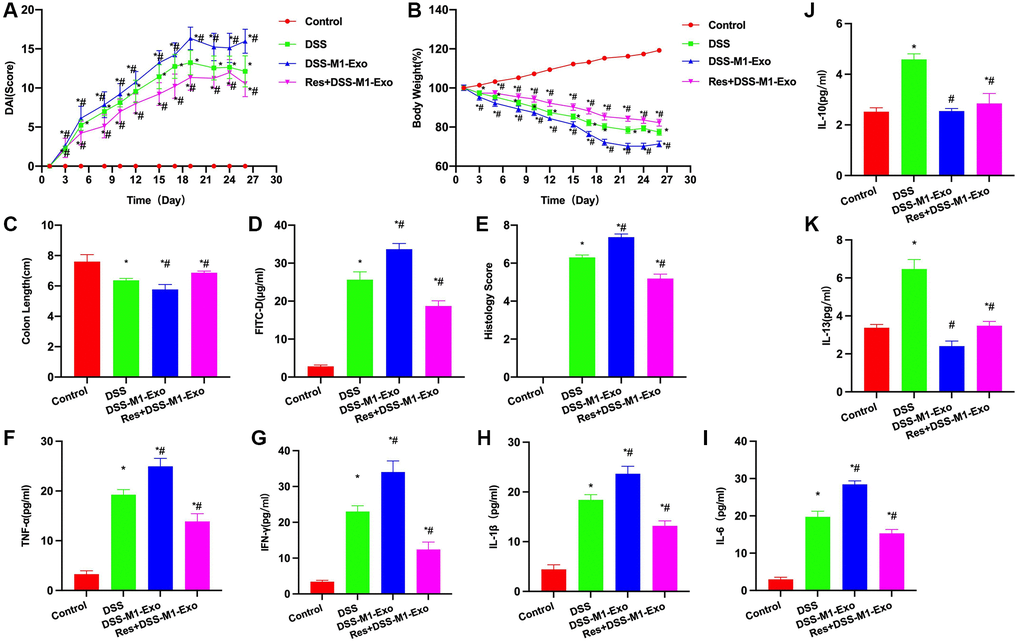 During mechanism research, animals were classified as Control, DSS, M1-Exo, or Res+M1-Exo group. Of them, Resatorvid (Res) was the TLR4 signal inhibitor, which was given simultaneously with M1-Exo through intragastric administration. The above operations were applied in the remaining treatments.