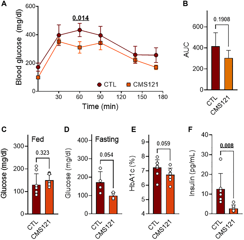 Glucose presented a tendency to lower levels in the glucose tolerance test (GTT, Figure 2A, 2B), and when evaluated in the blood after fasting (Figure 2D), which was not seen when glucose was assessed in fed animals (Figure 2C). In agreement with a lower glycemic status, glycated hemoglobin also presented a tendency to decreased levels (Figure 2E), while insulin levels were markedly decreased (Figure 2F) in the mice fed with the CMS121 diet.