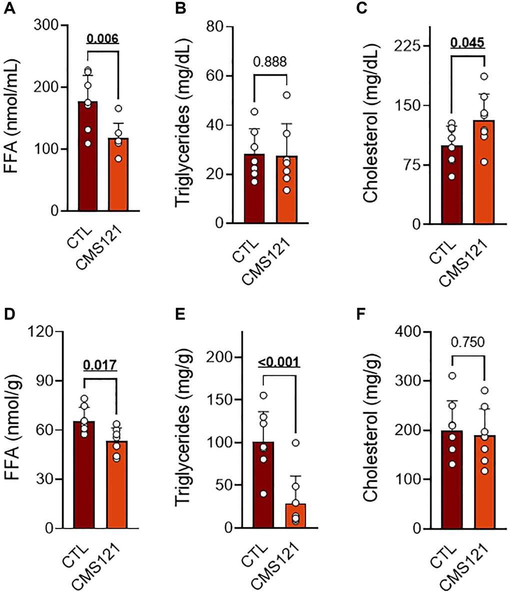 The CMS121 diet also altered the lipid status in blood and liver as compared to the control mice (Figure 3). A significant decrease in free fatty acids (FFA, Figure 3A) was seen in blood, while TG (Figure 3B) remained at control levels, and the cholesterol levels were increased (Figure 3C). A significant decrease in FFA (Figure 3D) and TG (Figure 3E) was also observed in the liver, while cholesterol (Figure 3F) remained unaltered.