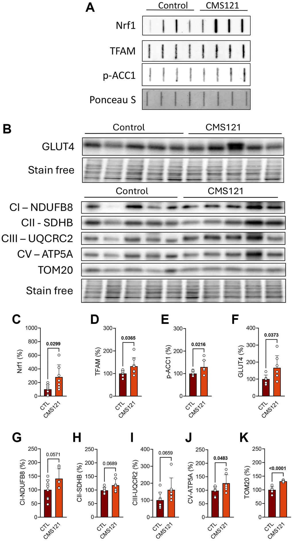 The clear metabolic changes, such as increased lean mass and metabolic activity, allied to lower glucose and lipid status, prompted us to investigate possible mechanisms underlying such alterations. We first investigated the status of mitochondrial proteins, transcription factors associated with mitochondria biogenesis, and markers of lipid and glucose metabolism in the adipose tissue (Figure 4), where representative blot images are presented in panels A and B, and their respective quantifications in C-K. Interestingly, two transcription factors associated with mitochondrial biogenesis were increased by the CMS121 diet, namely nuclear respiratory factor 1 (Nrf1, Figure 4A, 4C) and transcription factor A, mitochondrial (TFAM, Figure 4A, 4D), a response that is in line with an increase in mitochondrial activity, based on the tendency towards increased levels of respiratory complexes I, II, III and V (Figure 4B, 4G–4J). The translocase of outer mitochondrial membrane 20 (TOM20) was also increased by the diet (Figure 4A, 4K). The known inhibitory effect of CMS121 on lipid synthesis [14] was also observed in the adipose tissue, as phosphorylation of ACC1 was increased (Figure 4A, 4E). The levels of the insulin responsive glucose transporter solute carrier family 2 (facilitated glucose transporter), member 4 (GLUT4, Figure 4B, 4F) were also increased by the CM121 diet.