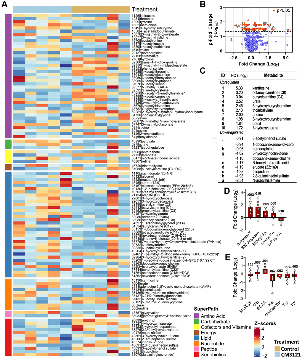 The volcano plot of the results (Figure 6B) shows the metabolites that were significantly influenced by the CMS121 diet (red circles). A similar number of metabolites were found to be increased or decreased by CMS121. When the top 10 increased metabolites (Figure 6C) were analyzed, it was found that acylcarnitine (4) and nucleotide (4) metabolites were the major groups. The top 10 decreased metabolites (Figure 6C) include 4 xenobiotics (3-acetylphenol sulfate, 3-hydroxyindolin-2-one, 2,8-quinolinediol sulfate, thioproline), and 3 lipids (docosahexaenoylcholine, 1-docosahexaenoylglycerol, and erucate).