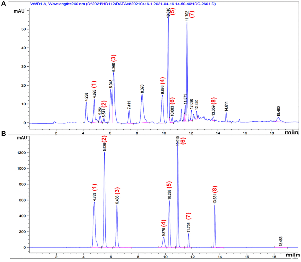 | Compounds | RetTime (min) | Area (mAU×s) | Content (mg/mL) |