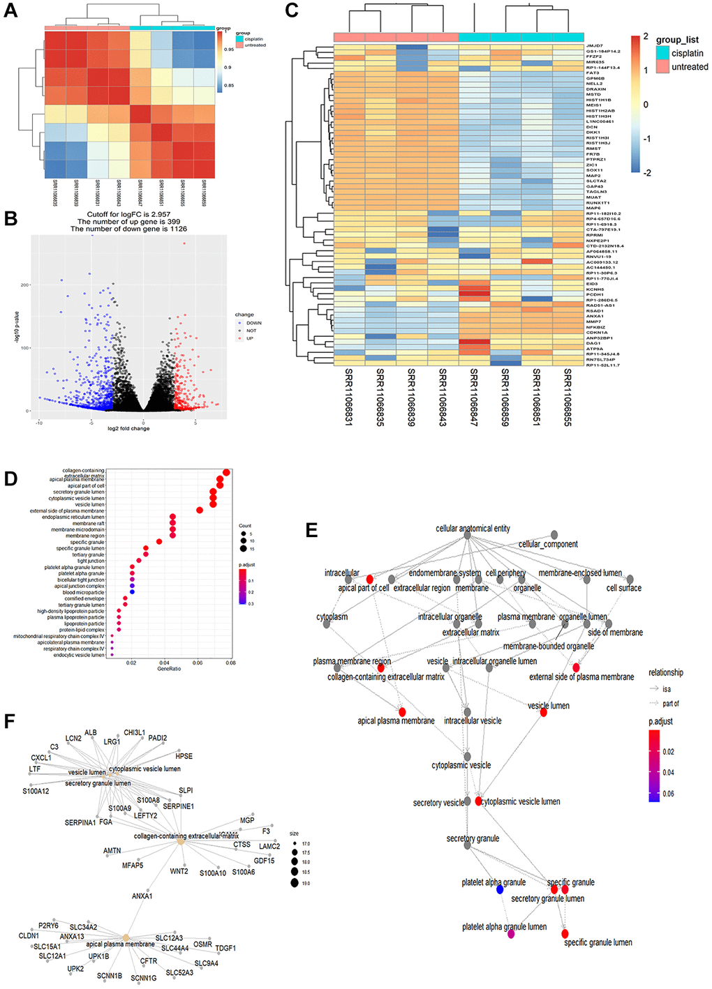 The expression matrix was assessed using intergroup and principal component analyses (PCA). Differential gene expressions between the cisplatin and untreated groups were predicted by a linear model using the Bioconductor package “DESeq2” [25]. Gene ontology (GO) and Kyoto Encyclopedia of Genes and Genomes (KEGG) metabolic pathway enrichment analyses were performed using the Bioconductor package “clusterProfiler” to obtain the key pathway information and other related information, visualized using R language [26].