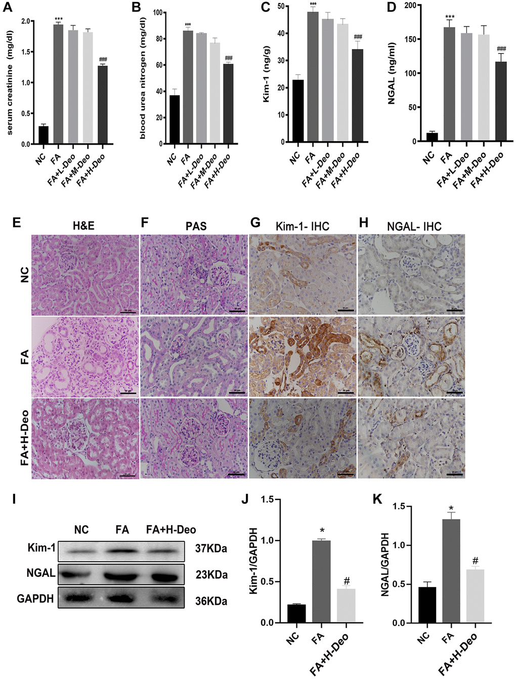 To explore whether 2’-deoxyadenosine can reduce the injury level by regulating the immune response in vivo, we established a mouse model of AKI induced by FA. We treated it with different doses of 2’-deoxyadenosine. Two days after FA administration, the average SCr and BUN levels were significantly higher in the FA group than in the NC group. The SCr and BUN levels in the FA+H+Deo group were significantly lower than those in the FA group (Figure 4A, 4B). Similar features were observed for NGAL and Kim-1 in the FA-induced AKI mouse model (Figure 4C, 4D). Therefore, we selected high doses of 2’-deoxyadenosine for subsequent experiments.