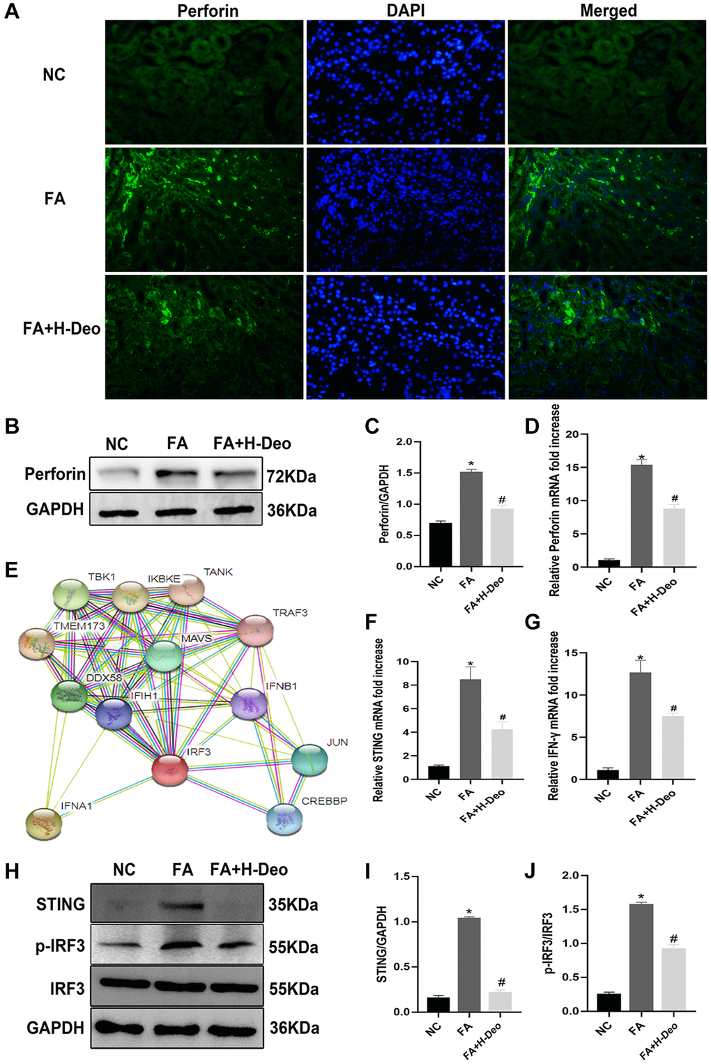 Perforin plays a major role in NK cell-mediated TEC injury. NK cell infiltration in kidney tissues was detected by immunofluorescence staining for the NK cell marker perforin (Figure 5A). These observations were further confirmed at the protein and mRNA levels by WB and qRT-PCR, respectively. FA mice showed significantly increased perforin expression compared with the NC group. These effects were alleviated by high doses of 2’-deoxyadenosine treatment (Figure 5B–5D). Bioinformatic analysis of PPI revealed an interaction between STING (TMEM173) and its downstream signaling molecules, TBK1, IRF3, and type I IFN (Figure 5E). IFN-γ (type II IFN), an important inflammatory indicator of kidney injury, was mainly released from NK and NKT cells. Through qRT-PCR analyses, we observed high expression of STING in AKI mice, and found that high doses of 2’-deoxyadenosine can reduce the expression level (Figure 5F). Treatment can also effectively reduce the release of inflammatory factors IFN-γ released by NK cells (Figure 5G). To verify the in vivo results of the inhibitory effect of high doses of 2’-deoxyadenosine on the STING pathway, we evaluated the levels of STING and IRF3 phosphorylation in kidney homogenates and found that they were downregulated upon high doses of 2’-deoxyadenosine injections by western blotting (Figure 5H–5J). These results confirmed the suppressive effect of high doses of 2’-deoxyadenosine on perforin and IFN-γ release via inhibiting STING/TBK1/IRF3 expression.