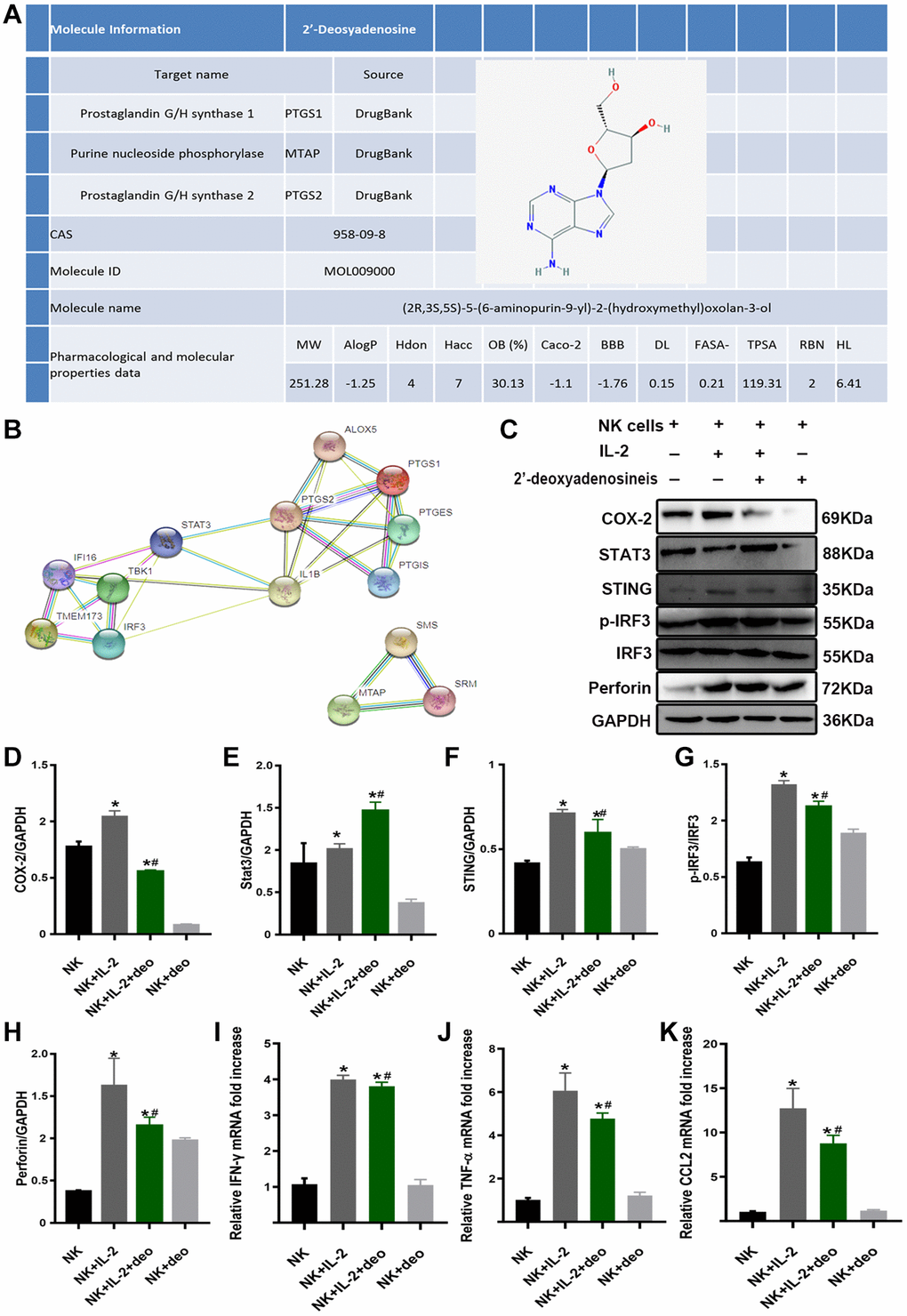 Since IL-2 secreted by T lymphocytes is responsible for stimulating the growth and differentiation of T cells, B cells, and NK cells [32], we used 1000 IU/mL IL-2 to treat NK cells in vitro to determine the source of perforin and IFN-γ release. Strikingly, activation of NK cells resulted in significantly increased expressions of COX-2, STING, p-IRF3, and perforin and decreased STAT3 by western blotting, whereas concurrent exposure to 2’-deoxyadenosine inhibited these protein expressions and elevated STAT3 expressions (Figure 6C–6H). Next, we examined the mRNA expression of inflammatory factors by qRT-PCR. As indicated in Figure 6I–K, the mRNA levels of IFN-γ, TNF-α, and CCL2 (chemokine monocyte chemoattractant protein-1, MCP-1/CCL2) were significantly elevated in IL-2-treated NK cells compared with those in the naïve NK group and were remarkably relieved by treatment with 2’-deoxyadenosine.
