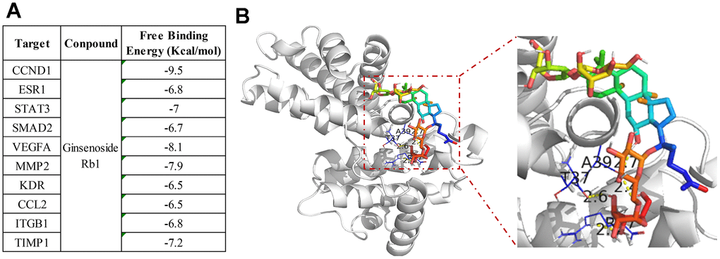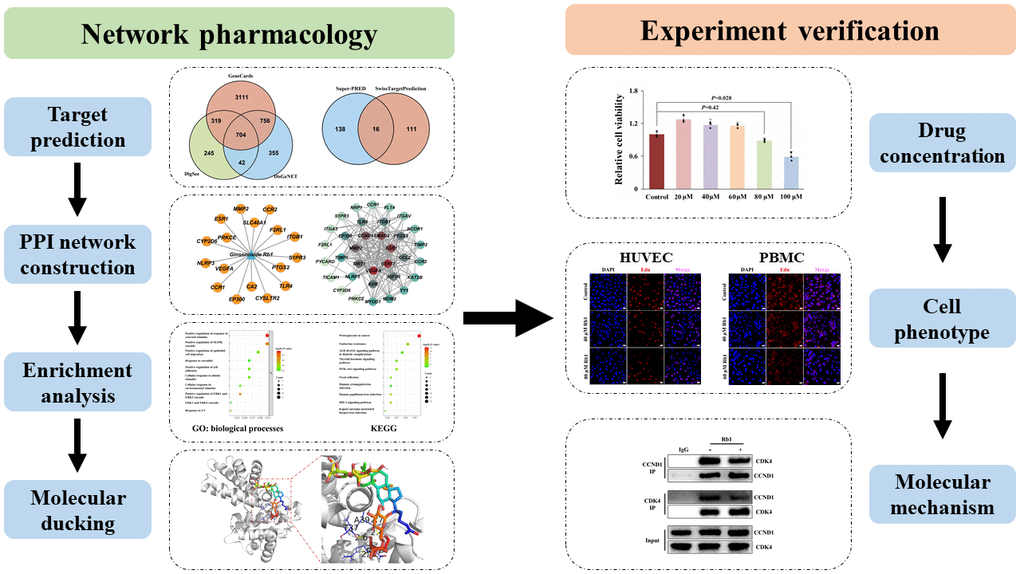 In conclusion, the network pharmacology identified 17 potential therapeutic targets of ginsenoside Rb1 in treating atherosclerosis and CCND1 has the highest binding energy with ginsenoside Rb1. The experimental verification demonstrated that ginsenoside Rb1 suppressed the vascular cell proliferation through inhibiting the interaction of CCDN1 and CDK4. Our study also provides evidence that the therapeutic effect of ginsenoside Rb1 on atherosclerosis may be partly achieved by inhibiting vascular cell proliferation.
