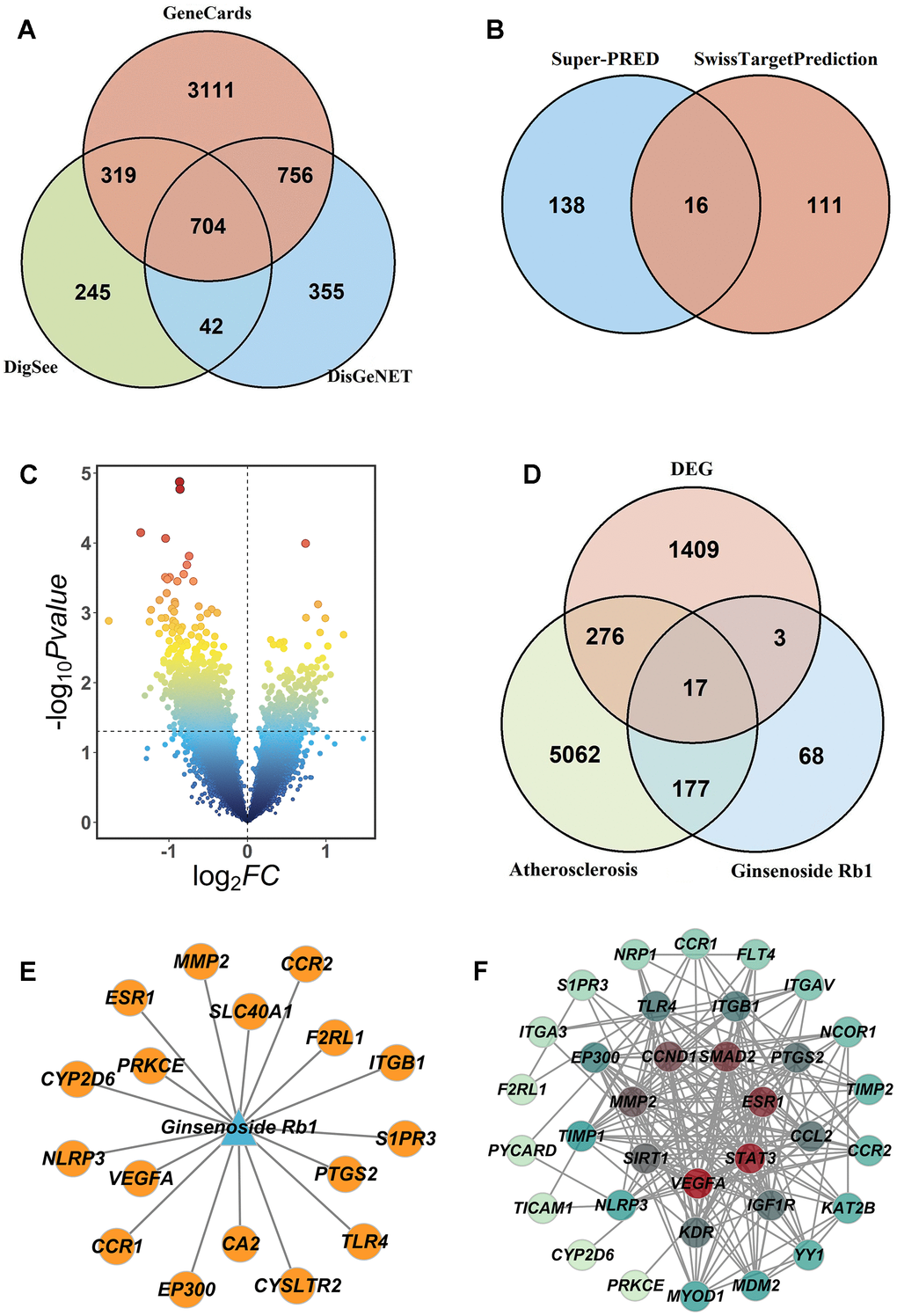 We obtained 4890 targets in Genecards database, 1310 targets in DigSee database, 1857 targets in DisGeNET database, and got 5532 atherosclerosis-related targets in the three databases (Figure 2A). Through deleting duplicate entries in the Super-PRED database and Swiss Target Prediction database, we identified 265 putative targets of ginsenoside Rb1 (Figure 2B). The GEO database (GSE202625, atherosclerosis patients) showed 1705 differential genes between the disease group and the control group (Figure 2C). Then, 5532 atherosclerosis-related targets, 265 drug targets and 1705 differential genes in atherosclerosis were intersected to obtain 17 ginsenoside Rb1 targets during atherosclerosis treatment (Figure 2D).
