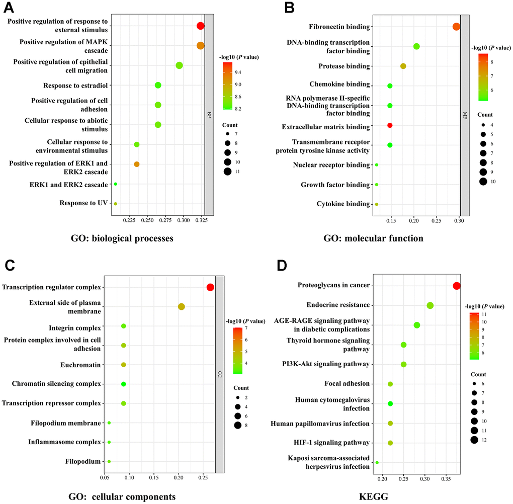 Then we used GO and KEGG enrichment analysis to further evaluate the underlying mechanisms of ginsenoside Rb1 in treating atherosclerosis. The top 10 GO enrichment terms of biological processes, molecular function, and cellular components were presented in a bubble diagram. The biological processes mainly involved positive regulation of response to external stimulus, positive regulation of MAPK cascade, response to estradiol, positive regulation of cell adhesion and cellular response to environmental stimulus (Figure 4A). The molecular function mainly involved fibronectin binding, protease binding, chemokine binding, extracellular matrix binding and cytokine binding (Figure 4B). Additionally, the cellular components were primarily associated with transcription regulator complex, integrin complex, protein complex involved in cell adhesion, transcription repressor complex and inflammasome complex (Figure 4C). KEGG pathway enrichment analysis was performed to screen potential targets and the results indicated that ginsenoside Rb1 modulates atherosclerosis development by multiple proliferation-related pathways, such as PI3K-Akt signaling pathway, thyroid hormone signaling pathway, proteoglycans in cancer, and AGE-RAGE signaling pathway in diabetic complications (Figure 4D).