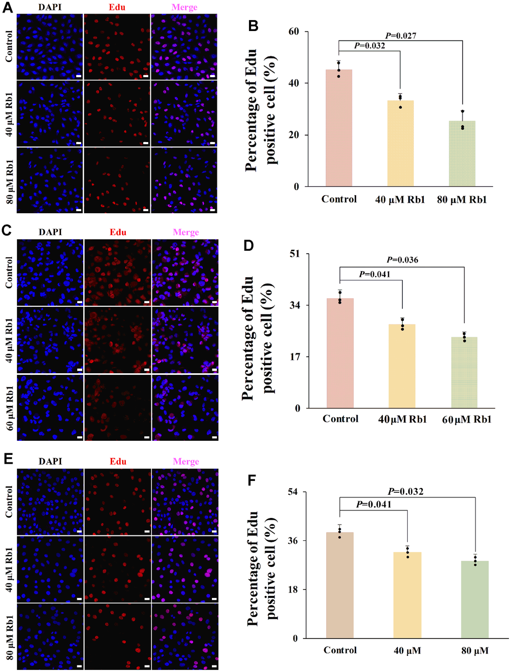 Cell proliferation capacity was measured by an Edu Kit (RiboBio, Guangzhou, China). Cells were seeded in 12-well plates at 2 × 105 cells per well. After incubation with different concentration ginsenoside Rb1 at 37° C for 24 hours, the cells were incubated with 100 mM of Edu reagent at 37° C for another 2 hours. After fixing the cells, we photographed them by the fluorescence microscope (Nikon, Tokyo, Japan).