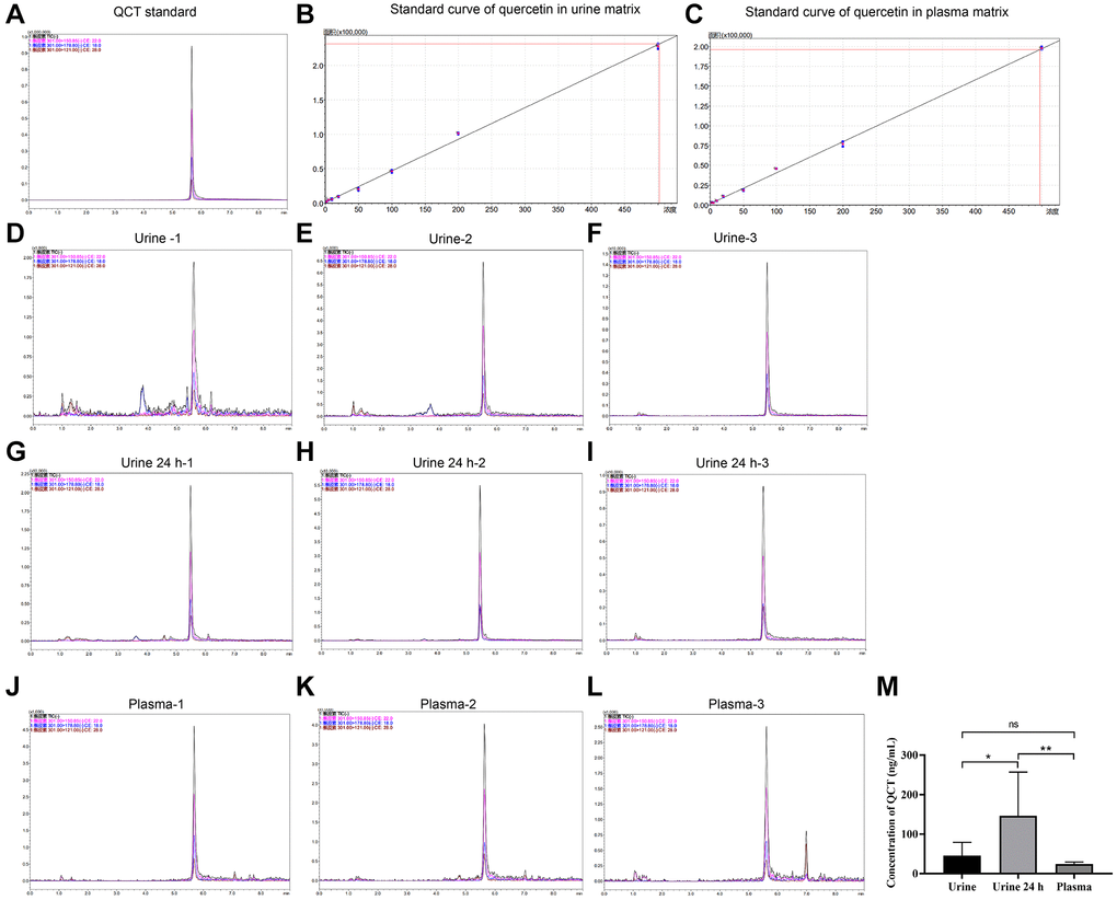 After acidification of 100 μL plasma or urine with 20% formic acid solution, 10 μL ascorbic acid was added to prevent oxidation of QCT. A total of 300 μL acetonitrile was added into the sample to extract QCT. After the QCT was centrifuged at 12000 r/min for 10 min, the supernatant was taken, and methanol was added into the residue to repeat the above extraction steps again. The mixed solution was air-dried by nitrogen flow, reconstituted by adding methanol solution, and filtered through a 0.22 μm microporous membrane. The samples were analyzed by Shimadzu LCMS-8040 triple and four-stage liquid chromatography-mass (LC-MS) spectrometry (Shimadzu, China).