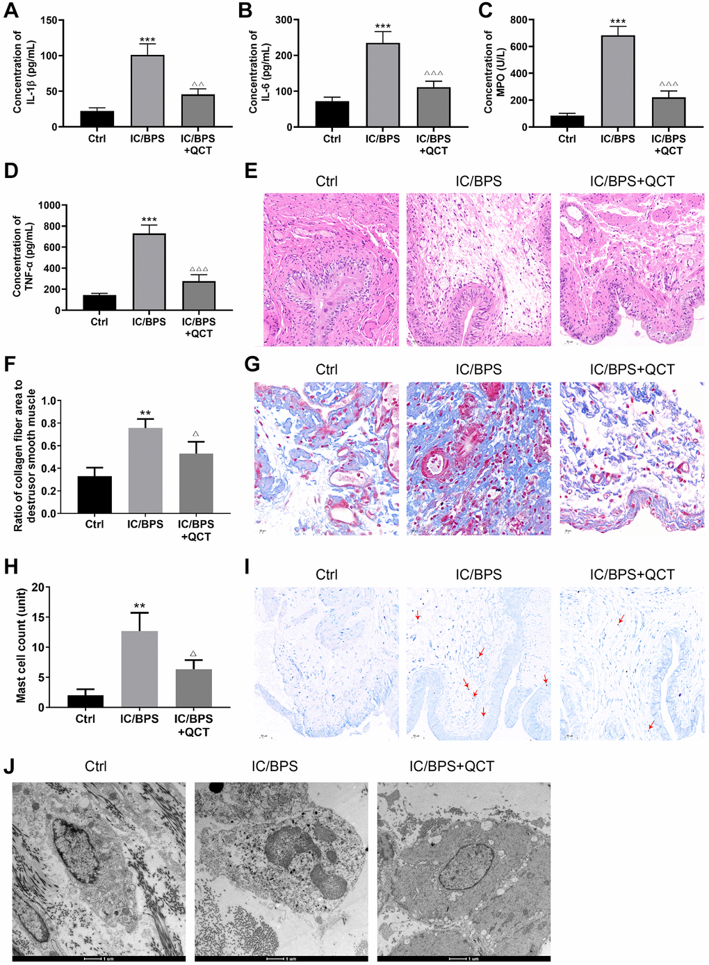 The results of the transmission electron microscope are shown in Figure 2J. In the bladder tissue of rats in the IC/BPS group, the mast cells infiltrated obviously, and the degranulated mast cells appeared vacancies. The particulate matter in the cytoplasm was released to the outside. The degranulation of mast cells was significantly improved in the QCT-treated group. The results demonstrated that QCT may alleviate LL-37-induced inflammation and the increase of collagen fibers and mast cells in rats.