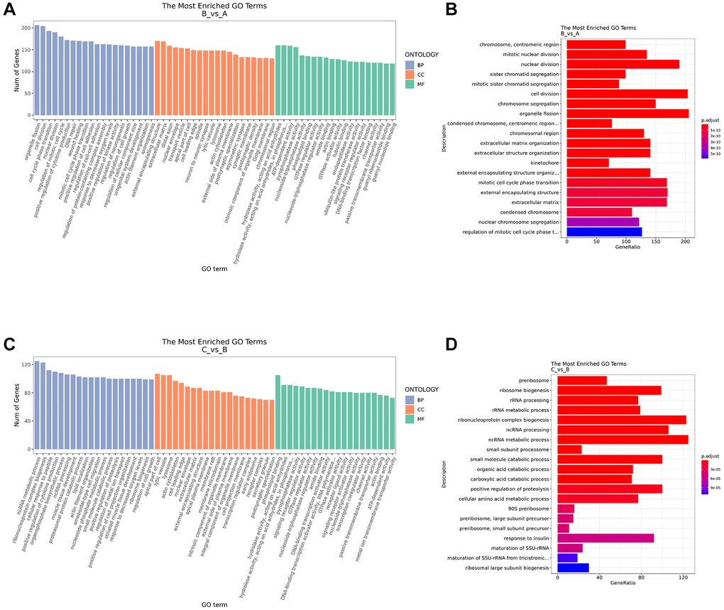 In order to further study the biological function of DE mRNA, GO enrichment analysis was carried out. The top 20 enriched GO terms in BP, CC and MF were shown in Figure 4A. Compared with control group, the terms of DE mRNA in the IC/BPS group mainly included organelle fission, cell division, nuclear division, external encapsulating structure, mitotic cell cycle phase transition, extracellular matrix, chromosome segregation, extracellular matrix organization, extracellular structure organization, external encapsulating structure organization (Figure 4B). Compared with the IC/BPS group, the GO terms of DE mRNA in the IC/BPS+QCT group mainly included ncRNA metabolic process, ribonucleoprotein complex biogenesis, ncRNA processing, small molecule catabolic process, positive regulation of proteolysis, ribosome biogenesis, response to insulin, rRNA metabolic process, rRNA process, cellular amino acid metabolic process (Figure 4C, 4D).