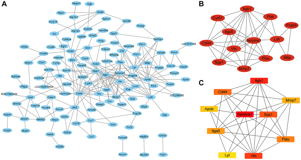 We intersected the mRNA that was DE at the same time in the IC/BPS vs. control group and the IC/BPS+QCT vs. IC/BPS group (|logFC| > 1 and P.adj <0.05). A total of 179 mRNAs were imported into the PPI network using STRING, there were 179 nodes and 435 edges in the PPI network (Figure 6A). We applied Cytoscape MCODE for further analysis and found that 13 central nods (Cyr61, Cd44, Spp1, Mmp7, Plau, Ldlr, Pcsk9, Mttp, Plat, Itgb1, Itga5, Vtn, Serpine1) formed the significantly modules among 179 nodes (Figure 6B). The hub gene of was confirmed by Cytobubba (a plug-in Cytoscape). The top ten genes included Serpine1, Itgb1, Vtn, Spp1, Cd44, Plau, Itga5, Mmp7, Apob and Lpl (Figure 6C). Among them, Serpine1, Spp1, Itga5, Mmp7 and Lpl were co-expressed in IC/BPS+QCT group and IC/BPS group (Table 5).