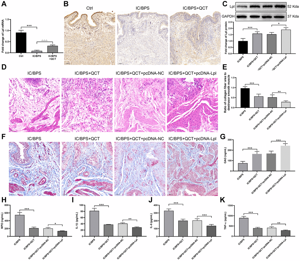 After feeding for one week, SD rats were randomly divided into 5 groups (Ctrl group n = 10, IC/BPS group n = 10, IC/BPS+QCT group n = 10, IC/BPS+QCT+pcDNA-NC group n = 5, IC/BPS+QCT+pcDNA-Lpl group n = 5). 150 μL LL-37 was slowly injected into rat bladder through catheter on the first, fourth and seventh day to establish rat model. On the eighth day, HE and Masson staining were used to identify the successful establishment of IC/BPS model.