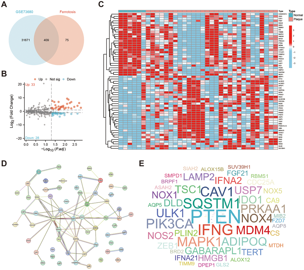 We first used the Venn plot to screen 409 ferroptosis-related genes that have intersections with the GSE73680 dataset (Figure 1A). With the threshold of |Log2 FoldChange|≥1 and adjusted P < 0.05, there are 61 ferroptosis-related genes identified as DEFERGs, and 33 of them were significantly upregulated in Plaque group, while 28 of them were significantly downregulated (Figure 1B). The heatmap showed the expression of these 61 DEFERGs in GSE73680 dataset (Figure 1C). An exploration into the protein-level connections between DEFERGs was conducted via the PPI network (Figure 1D). The word-cloud map showed the scale of the adjacent nodes of DEFERGs, reflecting the importance of PTEN, IFNG, SQSTM1, CAV1, MAPK1, PIK3CA, ADIPOQ, and MDM4 (Figure 1E). The adjacent nodes of DEFERGs were listed in Supplementary Table 4.
